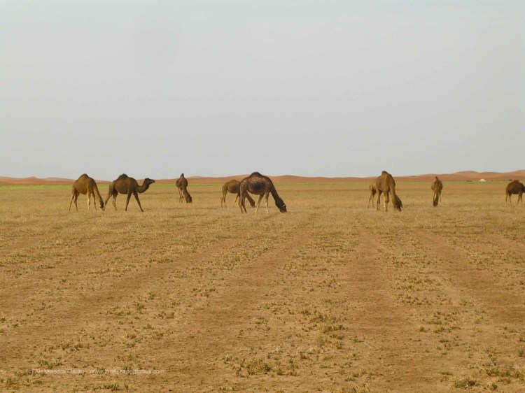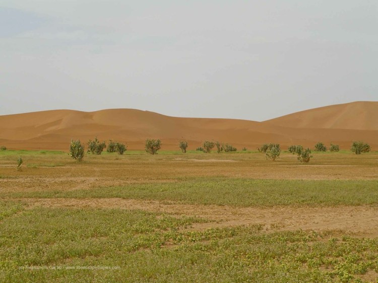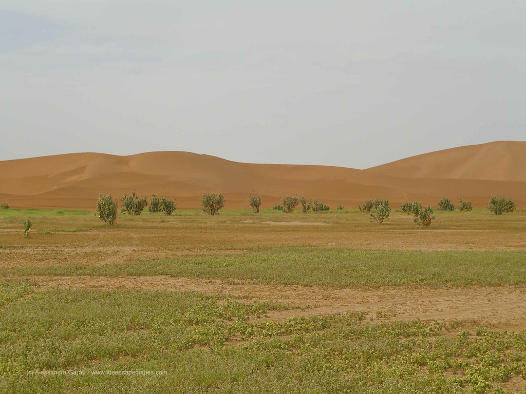 Dalle dune sabbiose di Chegaga il deserto cambia forma e colore e regala uno scenario completamente nuovo. Non prima di averci mostrato che anche nel deserto cresce l’erba.
