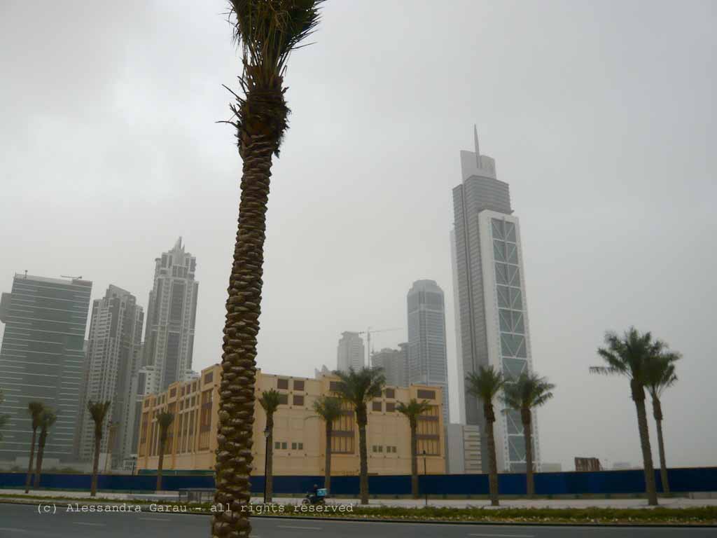Una delle cose che Dubai tende a far dimenticare di sé è dove si trova: nel deserto, nel senso di proprio sopra il deserto. E alle sue spalle sempre deserto e sabbia per chilometri. Il clima è arido desertico con estati incandescenti in cui il caldo è praticamente insopportabile e inverni molto miti. Ma una delle cose che capitano a Dubai è che quando soffia il vento da terra l’aria si riempie di sabbia creando una foschia e uno scenario che fa pensare ad una imminente apocalisse.