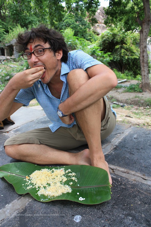 Il banchetto funziona così: dopo offerta, preghiera nel tempio e segni rossi sulla fronte (il tilaka), si viene dotati di foglia di banano, ci si siede buoni buoni per terra sotto un albero in compagnia di altri fedeli e di scimmie affamate (che ti fissano, e poi un uomo con un paiolo di riso, versa il riso sulla foglia e lo condisce con una salsina piccantissima rovente. Si mangia rigorosamente con le mani, anzi, con la mano destra. Eventuali avanzi vengono smaltiti felicemente dalle scimmie; poi la foglia/piatto viene lasciata su una pila vicino ad un rubinetto dove vengono sciacquate e riutilizzate (almeno credo). Come vedete dalla foto a dir poco imbarazzante, PP ha gradito moltissimo spazzolando tutto con grande delusione delle scimmie.