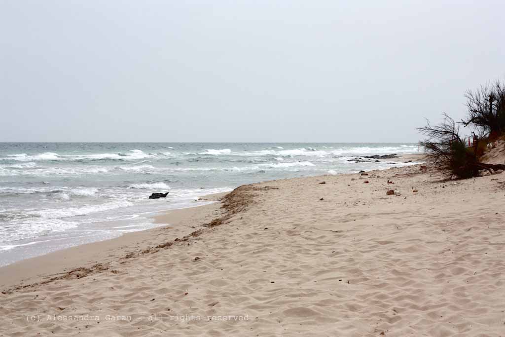 Ultima tappa del nostro mini-tour nel tacco d’Italia è stata la rinomata spiaggia di Marina di Pescoluse, che qualche genio del marketing ha pomposamente ribatezzato come “Maldive d’Italia”. E’ una spiaggia davvero molto bella e la giornata piovosa e ventosa ci ha permesso di vederla in una veste del tutto unica, e cioè deserta.