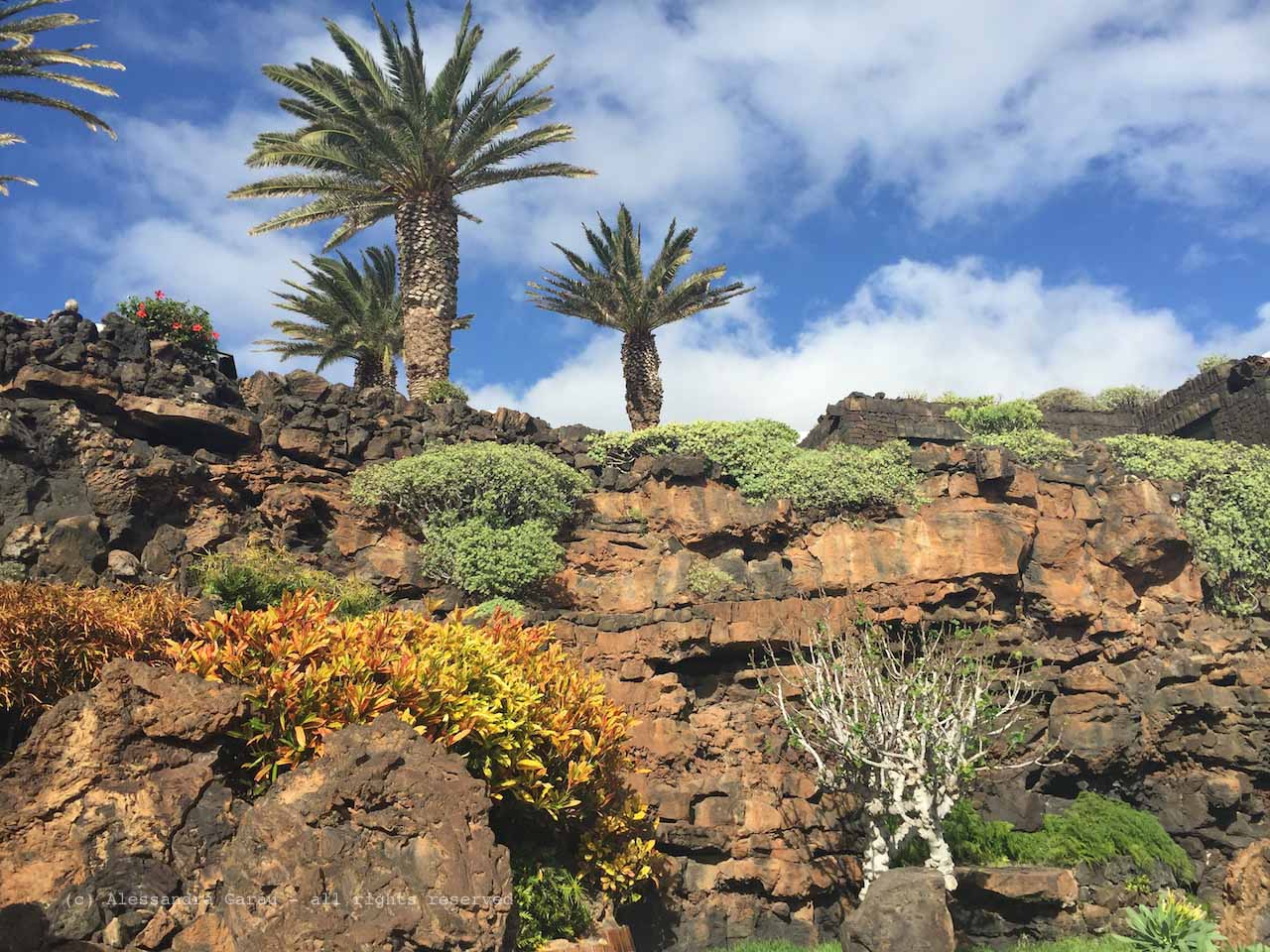 Risaliti dalla grotta sotterranea si esce alla luce del sole, in uno splendido giardino botanico che circonda una piscina dal fondo bianco che ricalca la forma dell’isola. Come nel caso della Fondazione, il tocco di Manrique è evidente nel gioco dei colori: nero, verde, azzurro, bianco. Il posto ha un che di onirico, lo apprezzo forse più oggi nel riguardare le foto che allora.