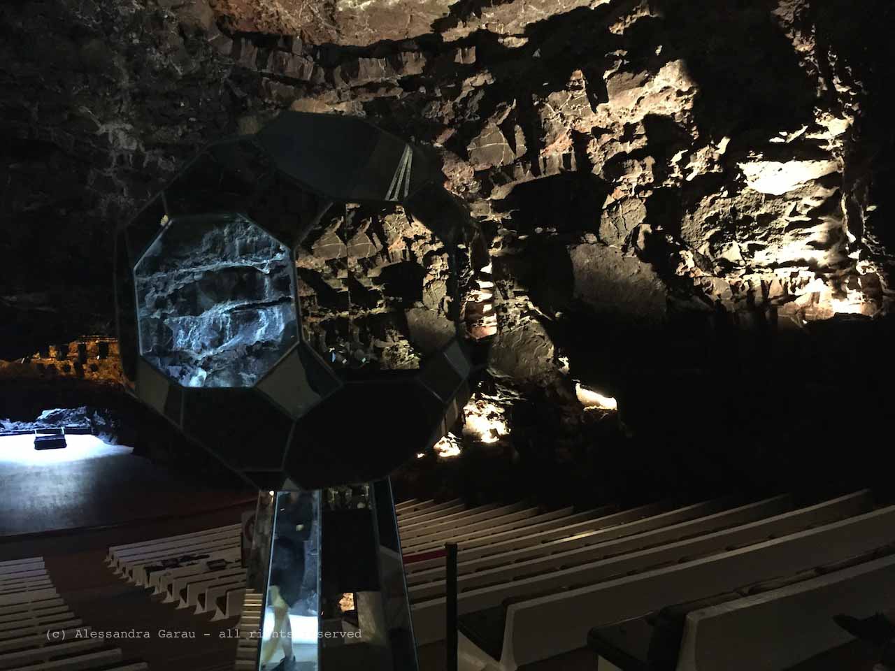Jameos del Agua è principalmente un ristorante dall’allestimento unico situato all’interno di grotte vulcaniche, il che di per sé è decisamente affascinante. Entrando si segue un percorso che scende in profondità nella roccia, tra tavolini e gradini di pietra vulcanica. Si arriva ai piedi di un piccolo lago sotterraneo, la dimora di una specie unica di piccoli granchi ciechi et albini (non molto fortunati a quanto pare) che si è selezionata nei secoli per vivere nell’oscurità di questo lago. Non sono riuscita a fare una foto più degna di questa causa assenza di luce.