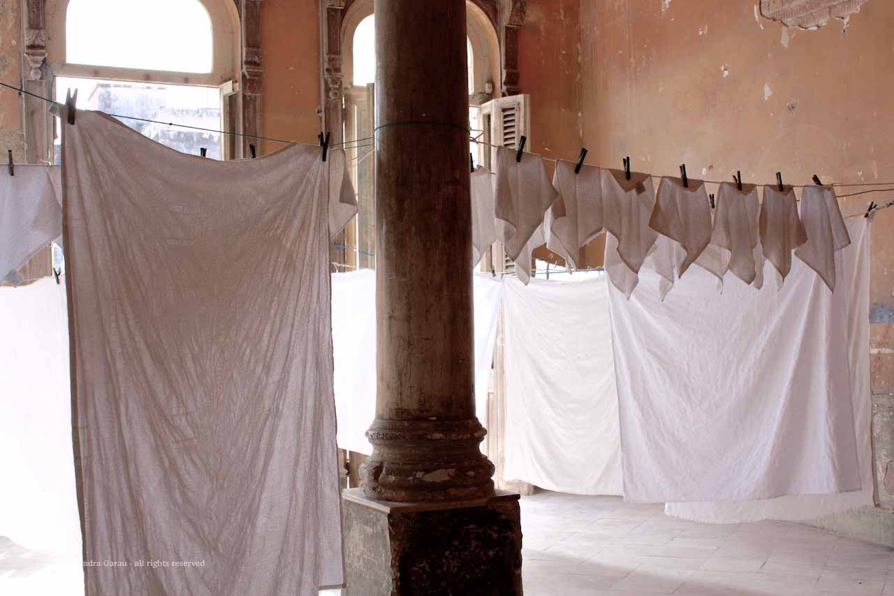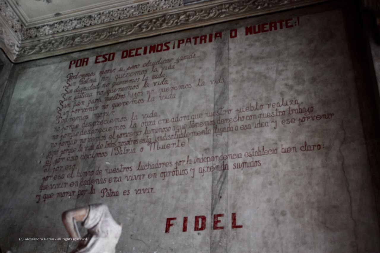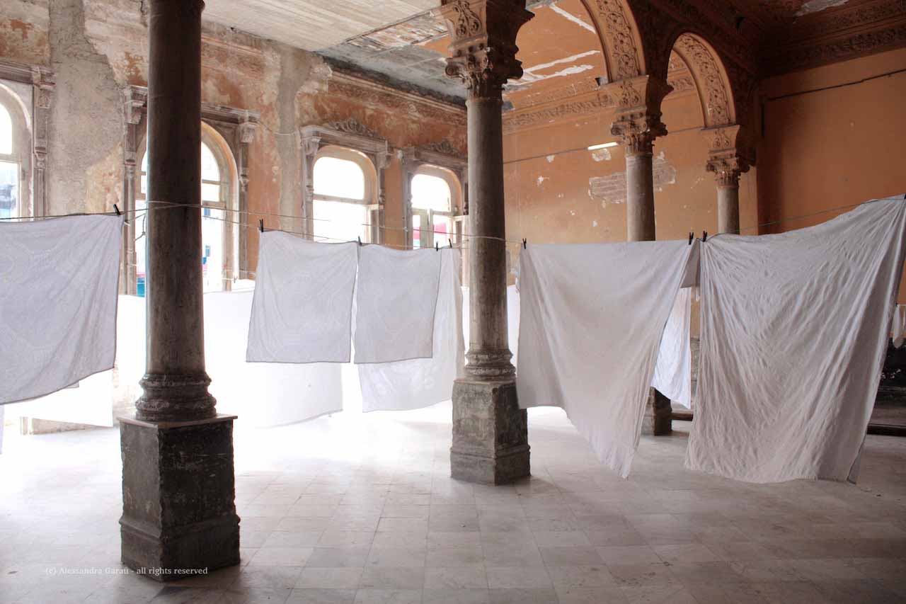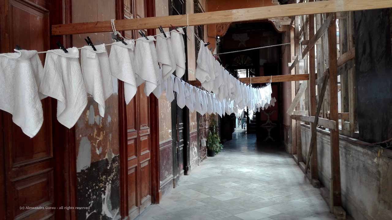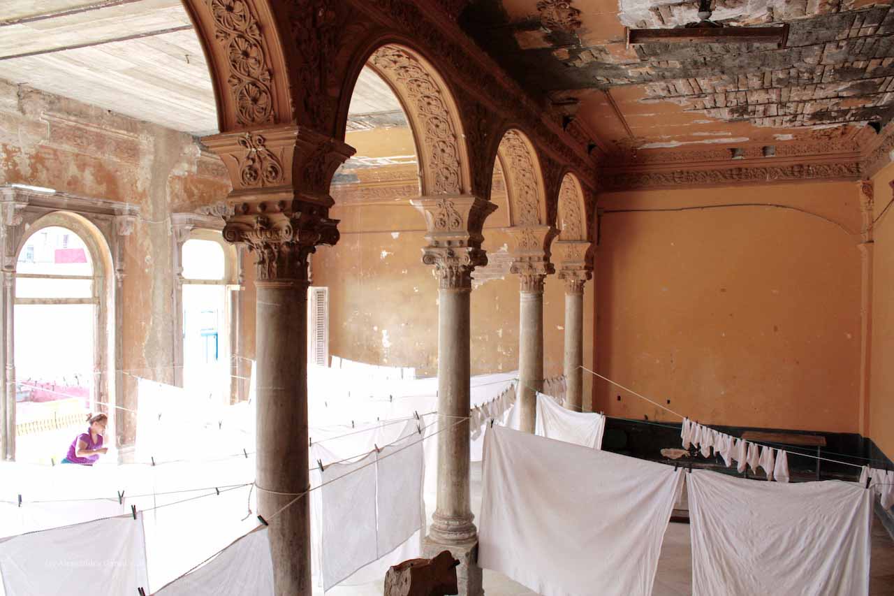 Dall’androne si apre una sontuosa scalinata, che però ha visto tempi migliori: una statua senza testa si staglia sulle parole di Fidel scritte sulla parete. Saliti al primo piano si aprirà uno spettacolo meraviglioso, il primo che vi regala questo posto incredibile: in un salone di archi e senza vetri alle finestre, una foresta di tovaglie e tovaglioli bianchi del ristorante è stesa ogni giorno ad asciugare.