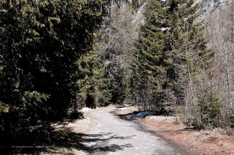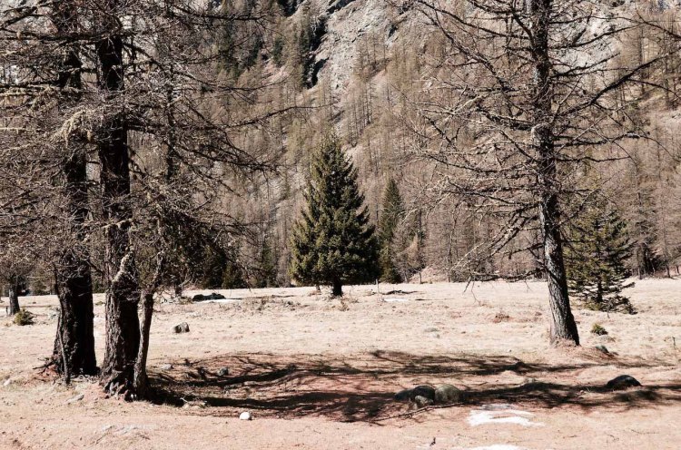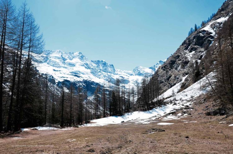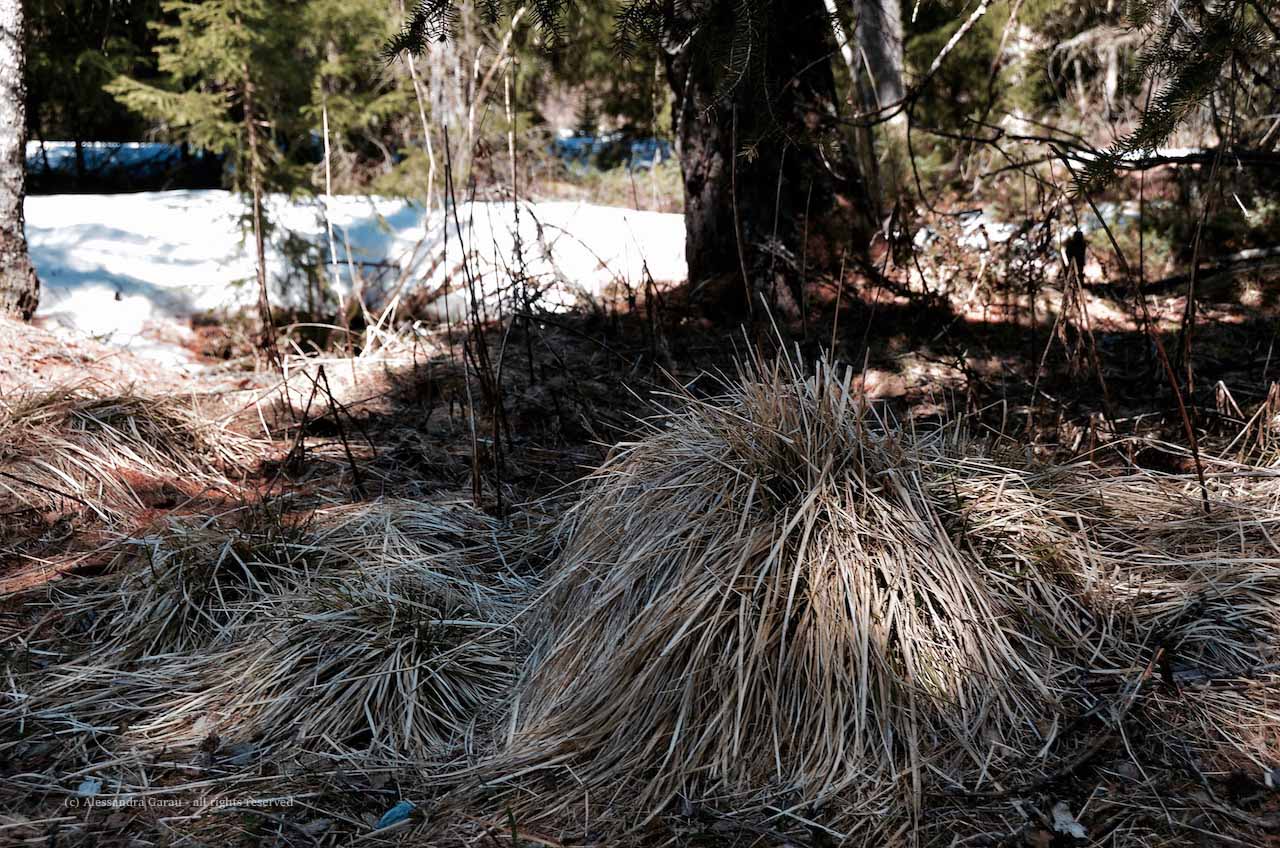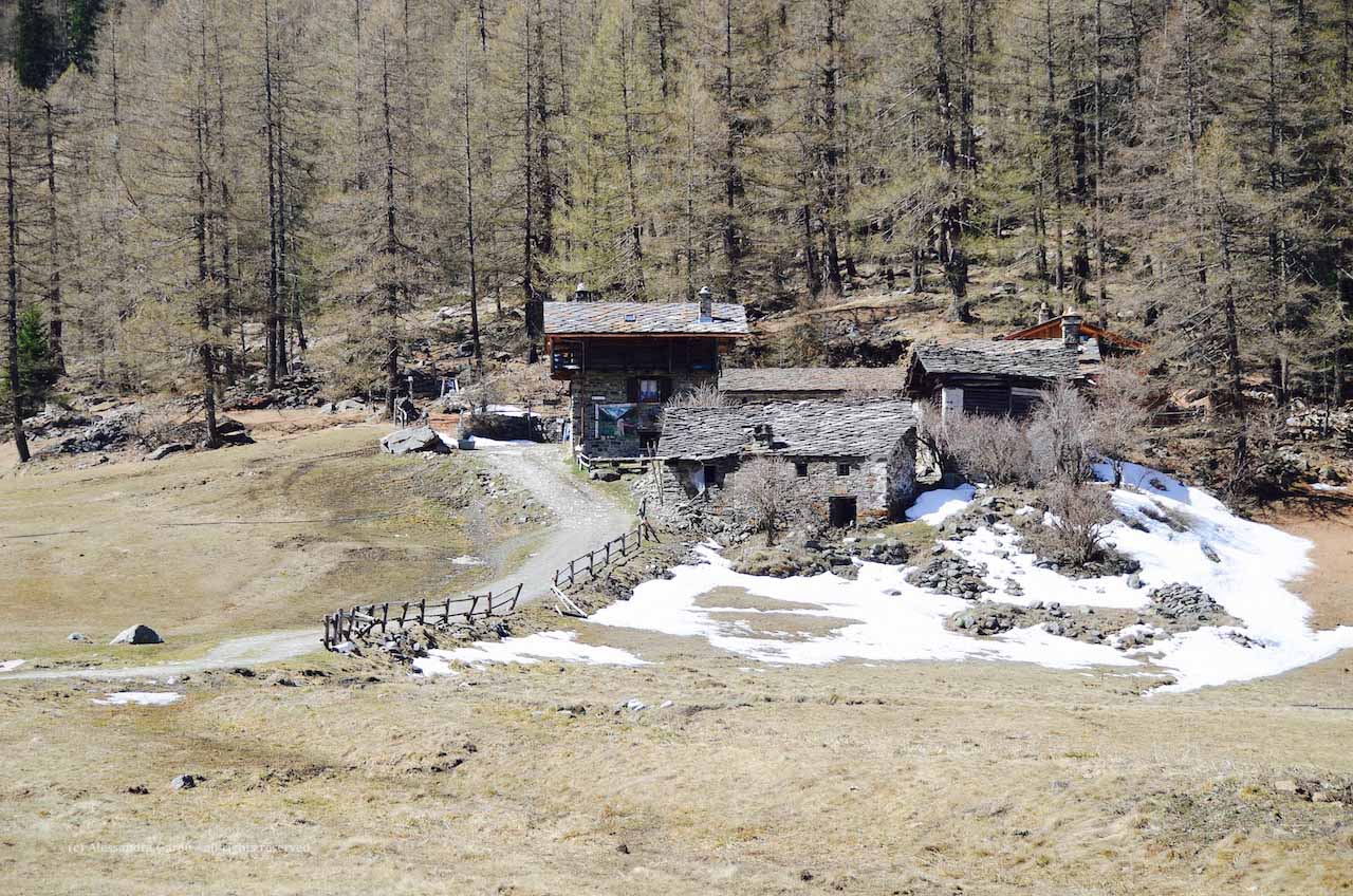 Sono affascinata dai colori del disgelo, l’erba è ancora secca e marrone, umida di neve, i rami degli alberi stanno cominciando a rigermogliare, alcuni sono ancora rinsecchiti e coperti da una barbetta di muschio. La primavera al Gran Paradiso si fa attendere un po’ di più. Penso a quanto sarà bello qui con i prati tutti verdi e le mucche al pascolo, sto già pensando a quando torneremo, magari in estate.