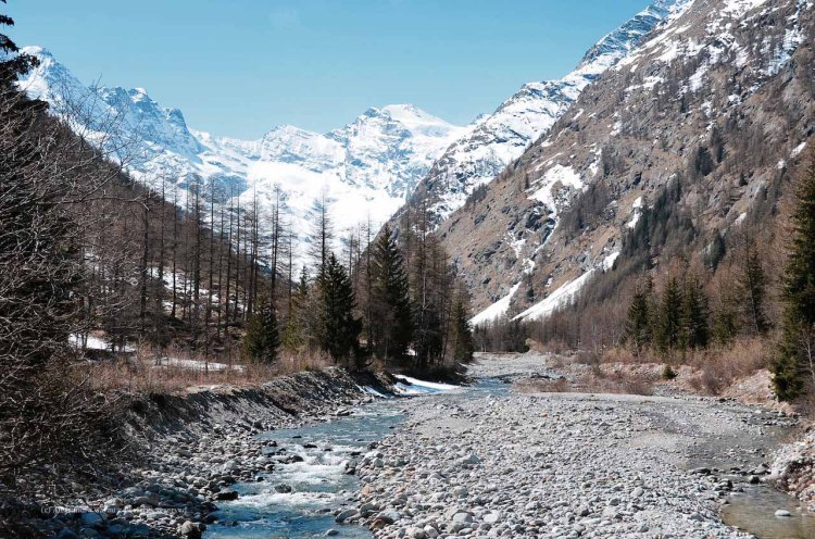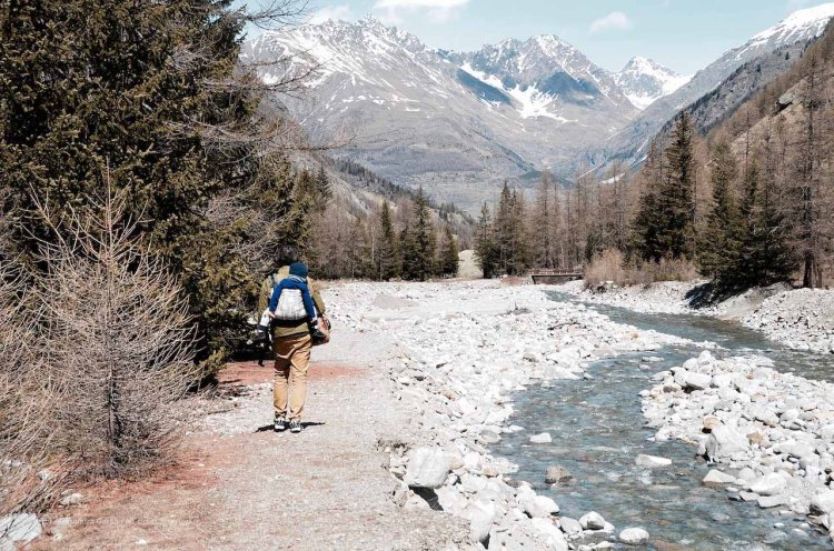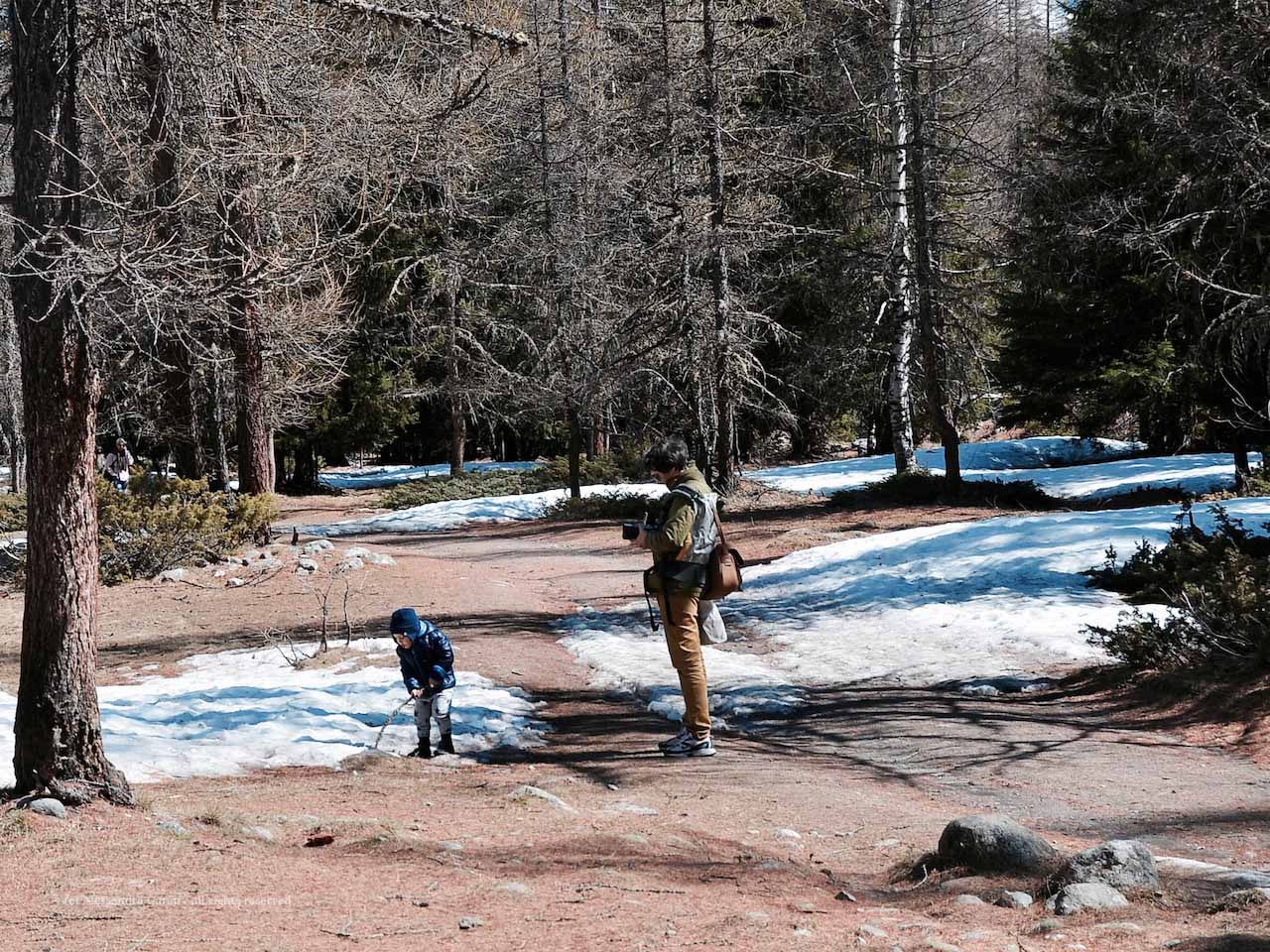 Orlando si diverte a saltellare sulla neve (io mi maledico per non avergli portato almeno i doposcì) e la nostra passeggiata è ricca di divagazioni: raccogliamo bastoncini con cui fare buchi nella neve, lanciamo sassi nell’acqua del fiume, rovesciamo pietre. Il panorama di fronte è sempre quello del Gran Paradiso: meraviglioso. Orlando cammina a lungo, non c’è salita, il sentiero è largo, qualche cane con il suo padrone ci passeggia vicino. Non portiamo il passeggino, ma solo il nostro fedele Tula: volendo però il sentiero sarebbe percorribile anche con un buon passeggino.