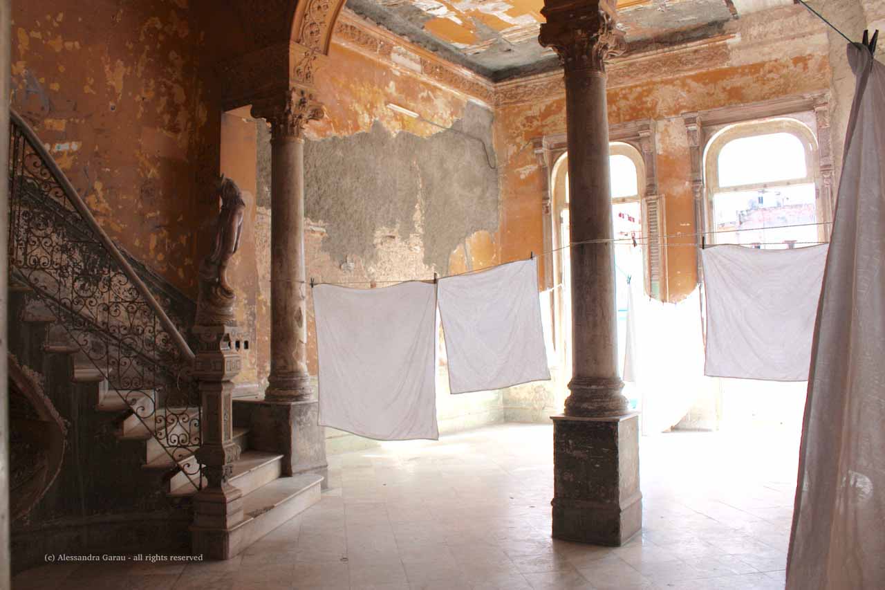 Proseguiamo su Concordia fino a trovarci davanti al bellissimo palazzo del Paladar La Guarida. Non avevamo una prenotazione, ma proviamo comunque a salire e a chiedere se c’è un tavolo per noi. Intanto ne approfittiamo per fotografare il bellissimo salone al primo piano nel quale ogni giorno vengono stese ad asciugare tovaglie e tovaglioli.