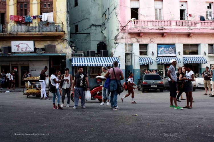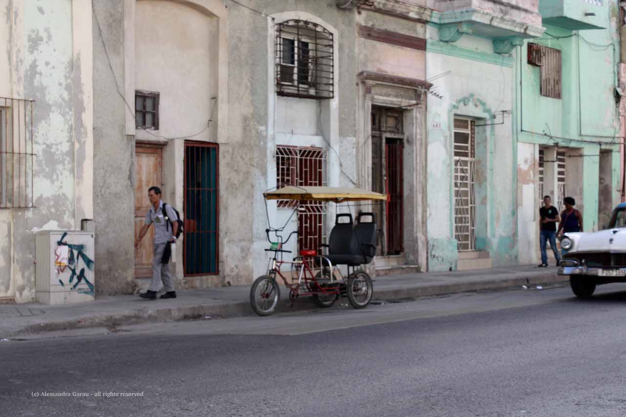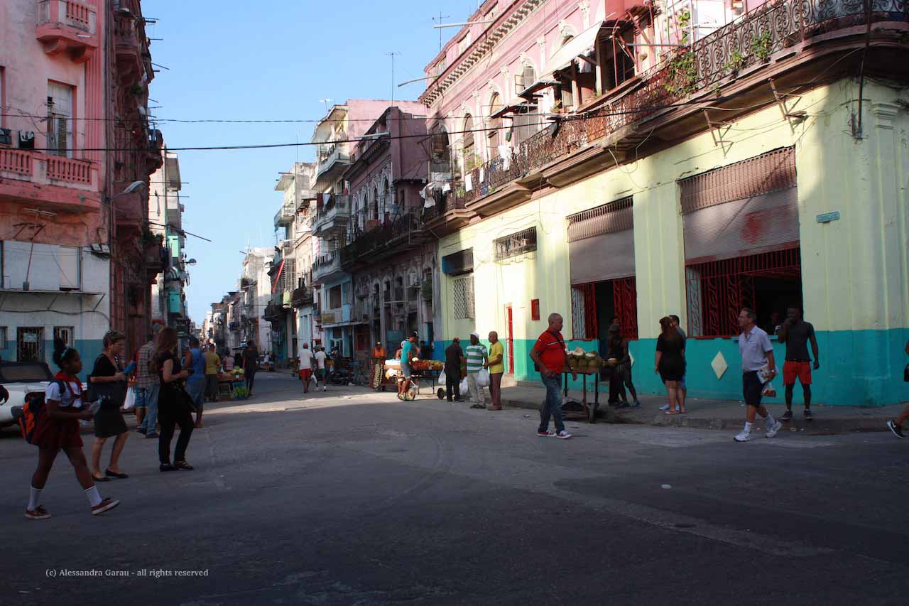 Anche se meno appariscenti dei palazzi del Vedado, anche qui si susseguono case finemente decorate che ricordano un passato illustre, in cui il denaro scorreva a fiumi nelle vie dell’Avana, tra gioco d’azzardo, mafia e prostitute. Oggi i palazzi sono decadenti, vien quasi paura che un cornicione ti possa crollare addosso da un momento all’altro, qualcuno si avvicina per chiederci se vogliamo sigari, ma mai in modo insistente. Le casas particulares si susseguono una appresso all’altra, mentre per le strade e i portoni c’è il continuo via vai degli abitanti.