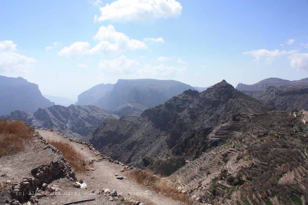 Questi sono i panorami del Saiq Plateau, a circa 2000mt di altezza. Un tempo una delle zone più remote e inaccessibili del paese, oggi comodamente raggiungibile attraverso una strada nuova di pacca, con un asfalto che sembra velluto. Superata una parte piuttosto costruita, si arriva a questa meravigliosa vista sulle valli, con un sentiero in terra battuta che porta a due piccoli centri abitati che sembrano usciti direttamente dal presepe della vostra parrocchia: si chiamano Al Ayn e Al Aqr.