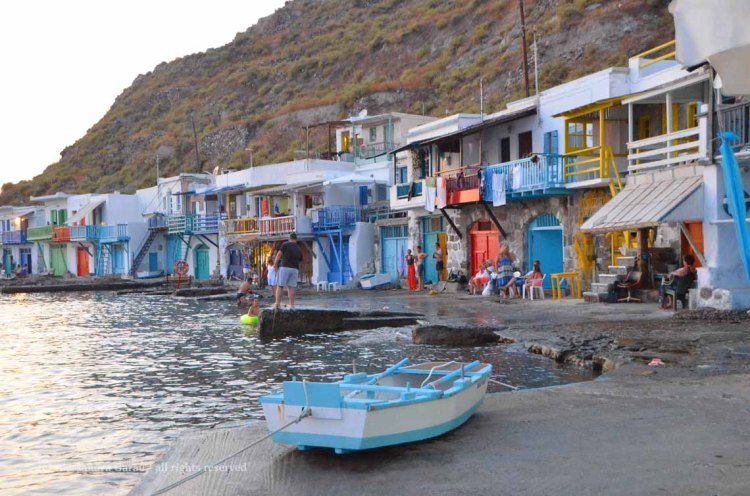 Milos è meno compatta di Sifnos, la piccola rotonda sul porto di Adamas è trafficatissima. Anche Milos ha la caldera, come Santorini, ma le sue sponde sono basse e la sua acqua, piatta come uno specchio, disegna un cerchio quasi perfetto. Decidiamo di noleggiare una macchina perché qui il sistema di autobus non ci permette la stessa flessibilità che a Sifnos. Milos, nonostante più trafficata, è molto più selvaggia di Sifnos e ha alcune spiagge pazzesche e panorami di altri mondi. Milos ha scogliere bianche, piccole insenature tra rocce multicolore striate di verde, spiagge di acqua cristallina con sorgenti termali, Milos ha alcune località di assoluta bellezza come Mandrakia, Plaka e Klima. A Milos i tramonti esplodono di rosso colorando le case bianche di rosa, mentre il sole si tuffa nel mare dietro il lato opposto della caldera. Milos è stupenda, ruvida all’inizio, morbidissima non appena si va oltre la superficie.