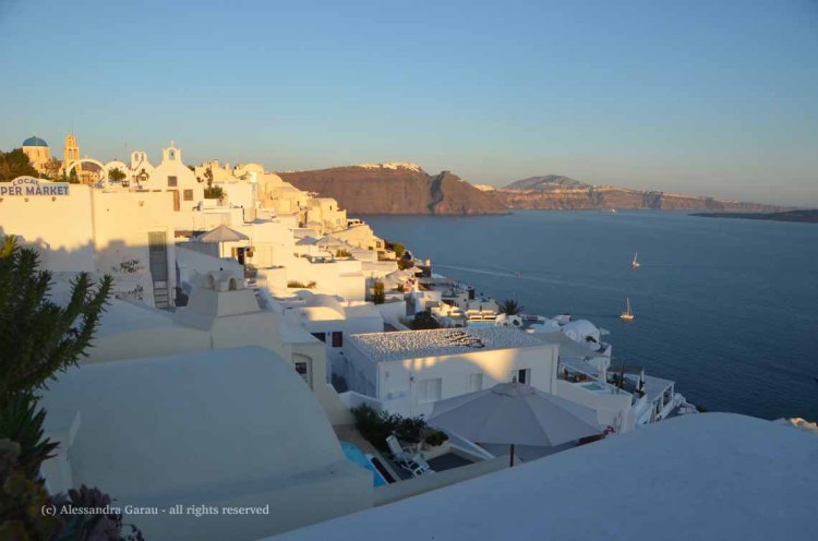 Santorini l’ho odiata e amata insieme. Ho sentimenti contrastanti per quest’isola, ma volevo venirci e sono contenta di esserci venuta. L’ho odiata quando ho sofferto per la prima volta in vita mia il mal di mare entrando nel porto, chiusa in quel terribile aliscafo che ondeggiava come non mai sul mare mosso dal vento e dalle altre navi del porto. L’ho odiata per il traffico, per i suoi infiniti cantieri edili ovunque, per i suoi milioni di turisti, tutti a far la coda negli stessi posti, per vedere lo stesso panorama. L’ho anche amata, però. Ho amato la luce della caldera, con quelle scogliere marroni alte centinaia di metri e il mare blu grigio della sera. Ho amato le casette di Oia e Fira, abbarbicate sulla parete di roccia, scintillanti al sole. Ho amato il tramonto visto dal faro e il color caffellatte delle casette di Pyrgos. Che poi Pyrgos è il mio posto preferito di tutta l’isola. Santorini, in ogni maledetta lista dei 100 posti da vedere assolutamente prima di morire, con il suo piccolo aeroporto, troppo piccolo per la mole di turisti che accoglie ogni giorno, tutti qui a vedere la luce del tramonto specchiarsi sulla caldera. Santorini, se ci rivedremo sarà a novembre.