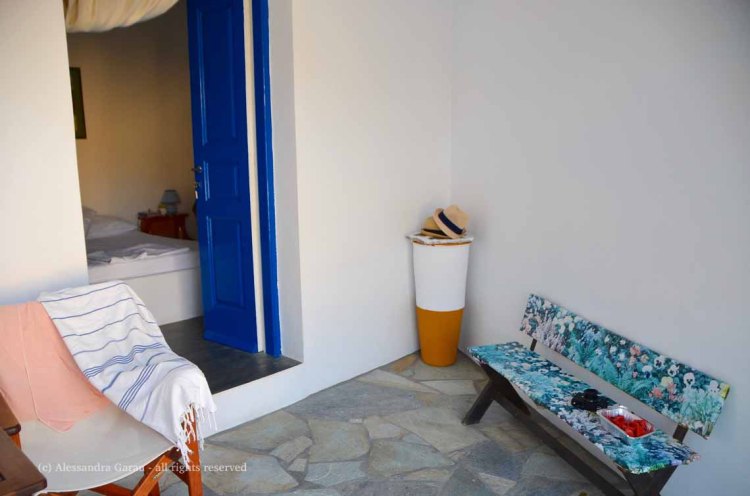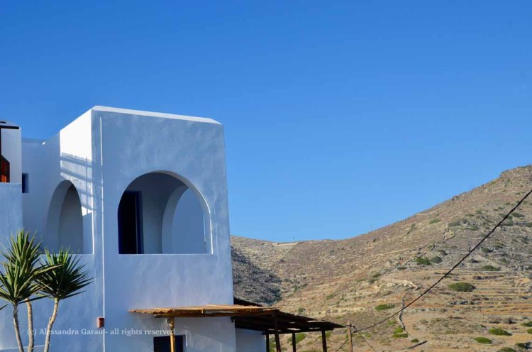Attraversiamo sulla sua macchina l’isola a forma di farfalla, percorrendo la strada principale che la attraversa per la lunghezza. Passiamo vicino alla Kora e ammiriamo per la prima volta Panagia e il suo iconico sentierino bianco che serpeggia sulla collina. Pochi minuti e qualche buca dopo siamo già ad Agali e ci arrampichiamo lungo una salita laterale. In cima alla collina che domina la baia c’è Agia Marina Rooms, un insieme di camere, terrazze e arcate bianche che si affaccia sul mare di Agali.