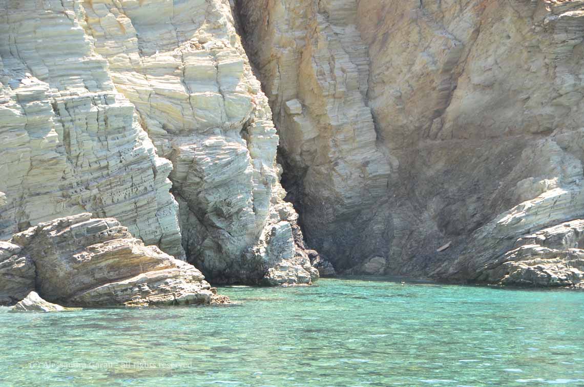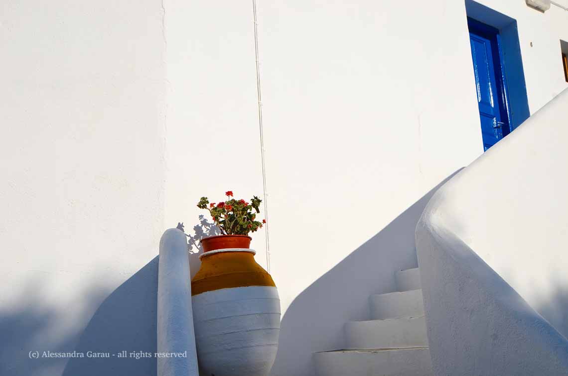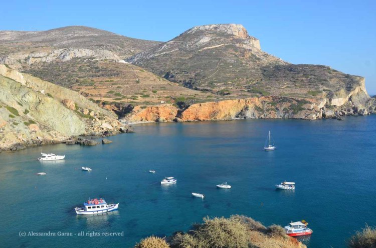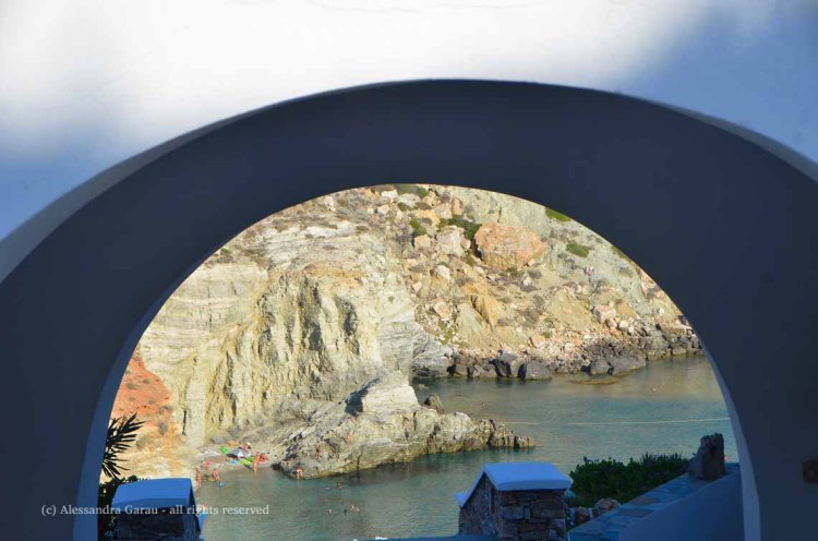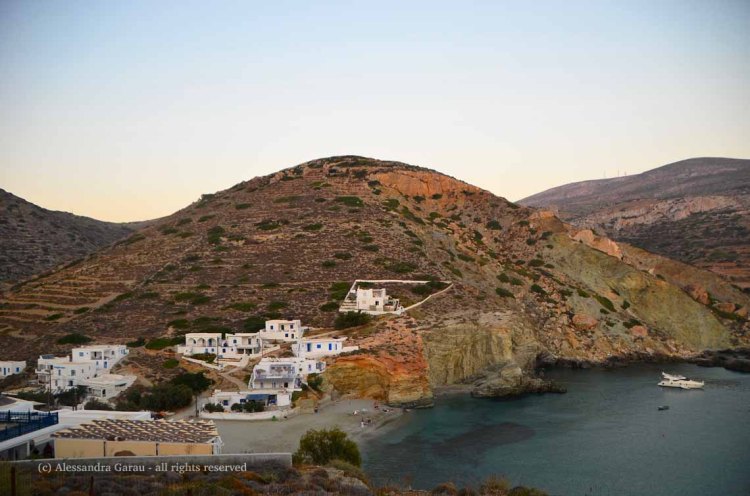 Il porto di Karavostasi è incredibilmente tranquillo, poche case bianche squadrate sullo sfondo delle colline color ocra, qualche macchina parcheggiata sul piccolo piazzale di fronte al molo dove attraccano gli aliscafi. Tra queste c’è anche la macchina di Vassiliki, che appena ci vede con il passeggino ci riconosce subito e ci viene incontro. Io invece rimango un attimo spiazzata: mi aspettavo un omone greco baffuto, non una giovane ragazza! Il nome Vassiliki è la versione femminile di Vassilis, ci spiega lei, ed ecco qui risolto l’arcano. Il sistema di trasporti di Folegandros è molto semplice: un unico autobus, nemmeno nuovissimo, effettua poche corse giornaliere collegando i principali centri abitati dell’isola: Karavostasi, la Kora, Agali e Ano Meria. Fine. Per questo Vassiliki va a prendere e accompagna personalmente i suoi ospiti al porto.