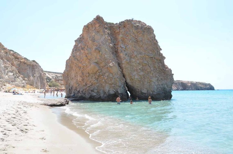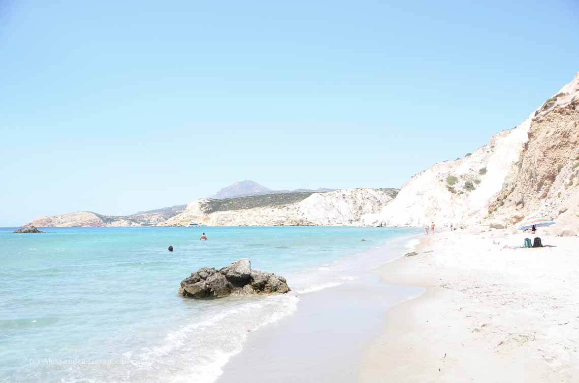 Una delle spiagge più famose (e frequentate) di Milos è Firiplaka, una lunga striscia stretta e bianca dall’acqua cristallina. Sulla spiaggia c’è un servizio di ombrelloni e lettini ma non ricordo vendita di cibo e bevande. C’è un parcheggio abbastanza selvaggio di terra battuta e la spiaggia ad agosto è piuttosto affollata.