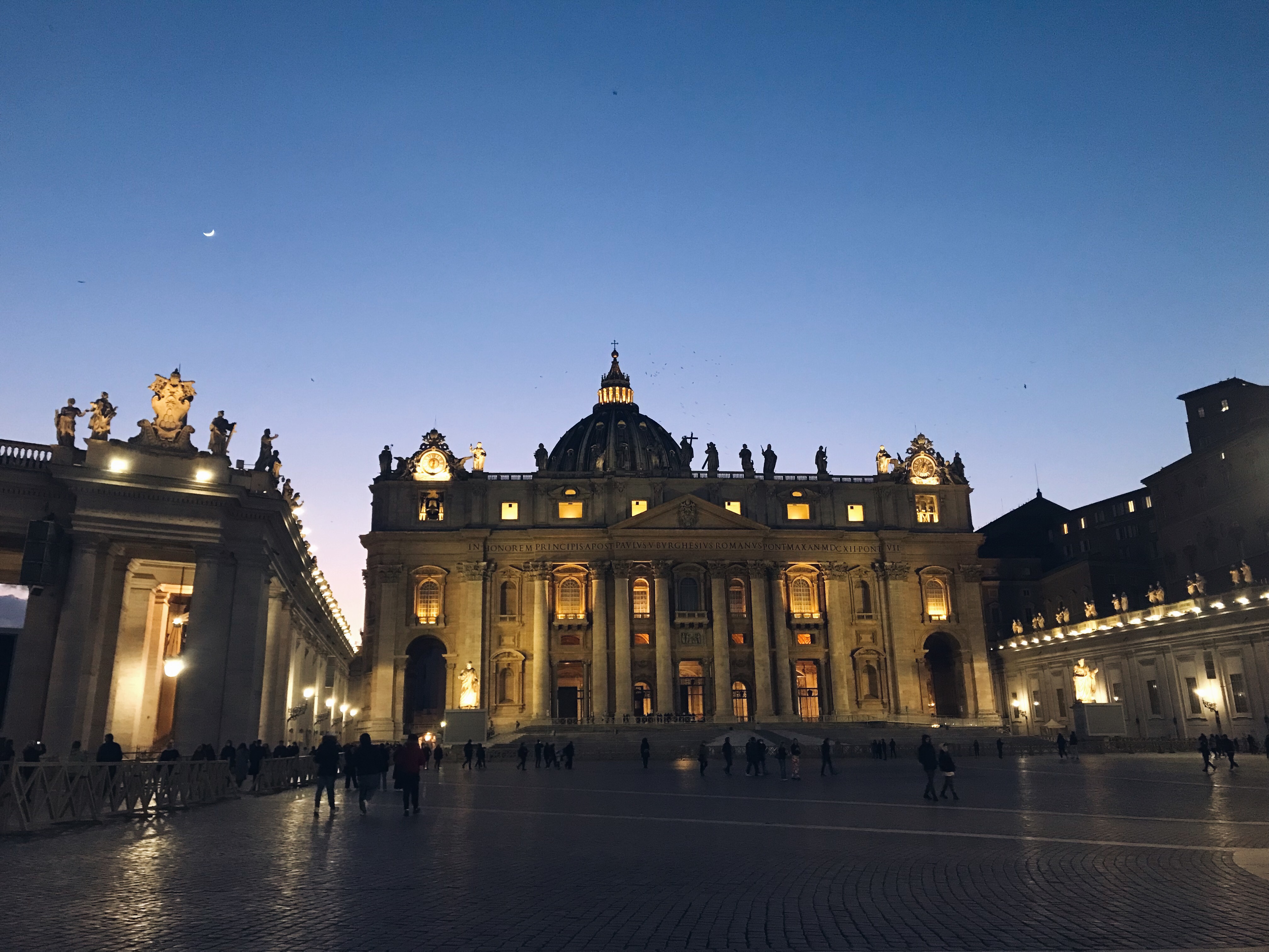 - Piazza del Popolo e Piazza San Pietro: dal Pincio, sopravvissuti alle follie del risciò, scendiamo verso Piazza del Popolo e poi proseguiamo verso Prati dove facciamo una tappa per un gelato alla Gelateria La Romana in Via Cola di Rienzo. Da qui (saltiamo la visita a Castel Sant’Angelo per questioni di tempo) arriviamo a Piazza san Pietro. Non visitiamo l’interno della basilica perché sono passate le 18:00 e ormai è chiusa, ma mostriamo a Orlando il punto del centro del colonnato e ammiriamo l’immensa piazza illuminata. Concludiamo con un aperitivo al Cambio a Trastevere.